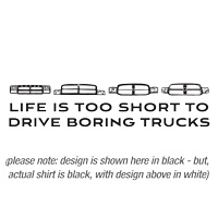 Life is too short to drive boring trucks. Geno's Garage t-shirt with 4 generations of Ram truck grills.